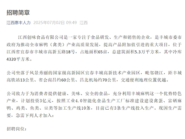 江西創(chuàng)味食品有限公司是一家專注于食品研發(fā)、生產和銷售的企業,是豐城市委市政府為推動全市麻鴨(禽類)產業高質量發(fā)展,提高產品附加值引進的重大項目,位于江西省宜春市豐城市高新五路18號,占地面積65畝,總建筑面積5.3萬平方米,其中冷庫4320平方米。公司坐落于風...